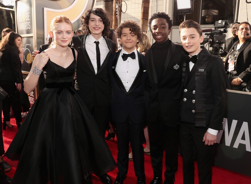 From the Netflix show Stranger Things, actors (left to right) Sadie Sink, Finn Wolfhard, Gaten Matarazzo, Caleb McLaughlin and Noah Schnapp arrive at the awards.