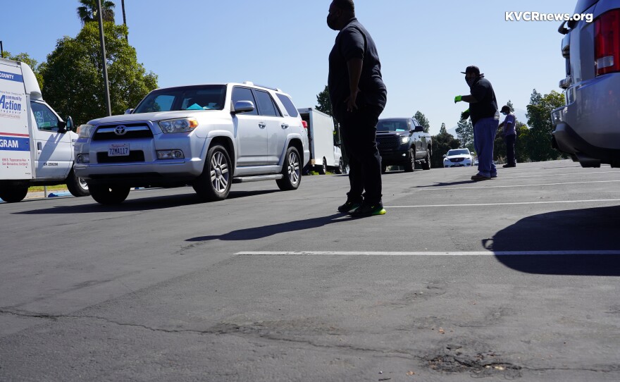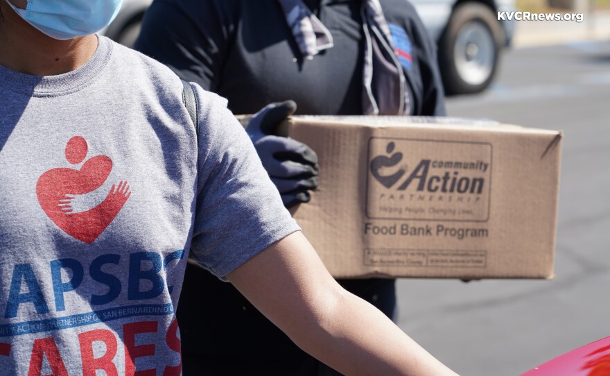 The Community Action Partnership of San Bernardino County held a drive-thru food distribution event at San Bernardino Valley College today. KVCR’s Andrew Caravella interviewed the CEO of the organization, Patricia Nickols-Butler.