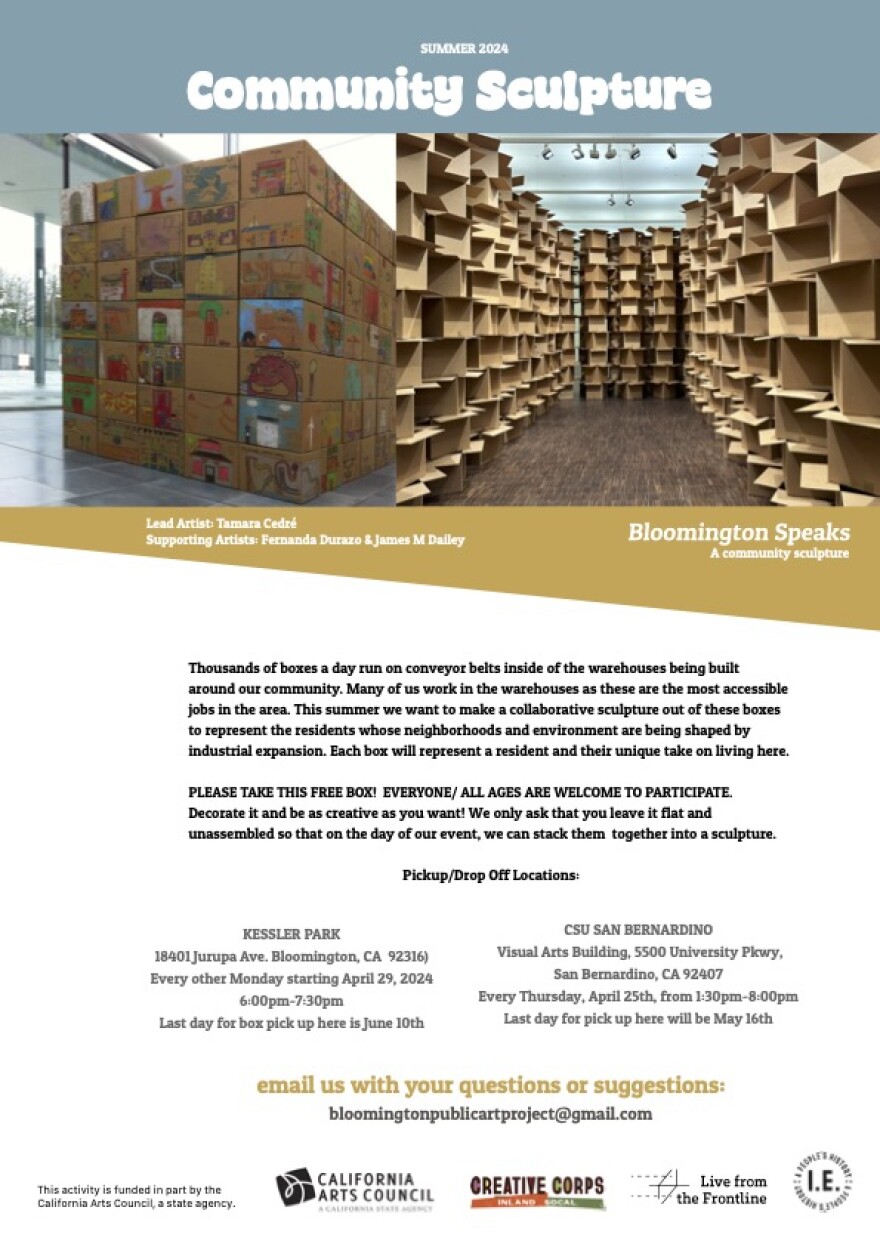 The sculpture is being coordinated by the People’s History of the Inland Empire…with the support of the California Arts Council and Creative Corps of Inland Southern California.