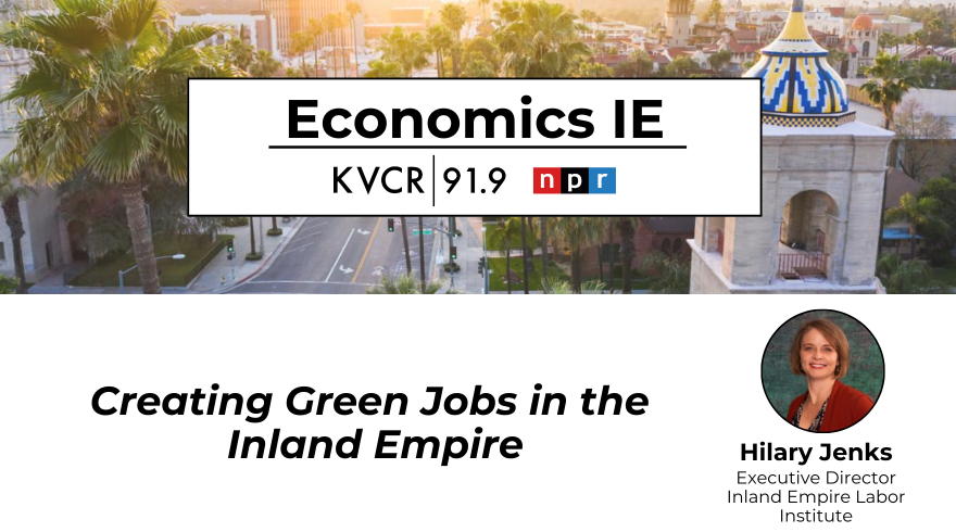 For 91.9 KVCR News, I’m Madison Aument. This is Economics IE. Today I’m talking with Hillary Jenks who is with the Inland Empire Labor Institute to talk about Plug In IE and their work trying to bring green jobs to the area. Can you kind of explain what plug in IE is?